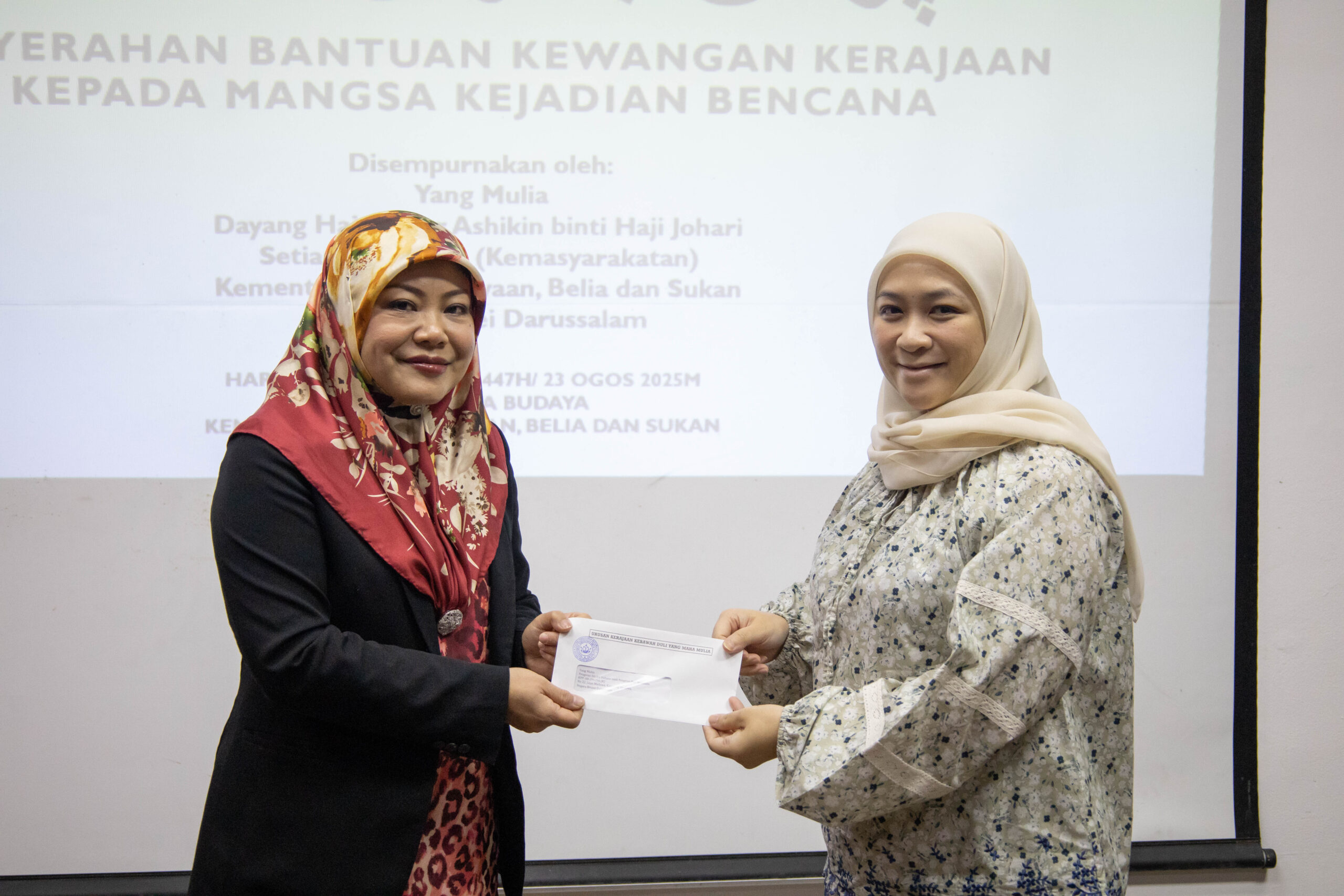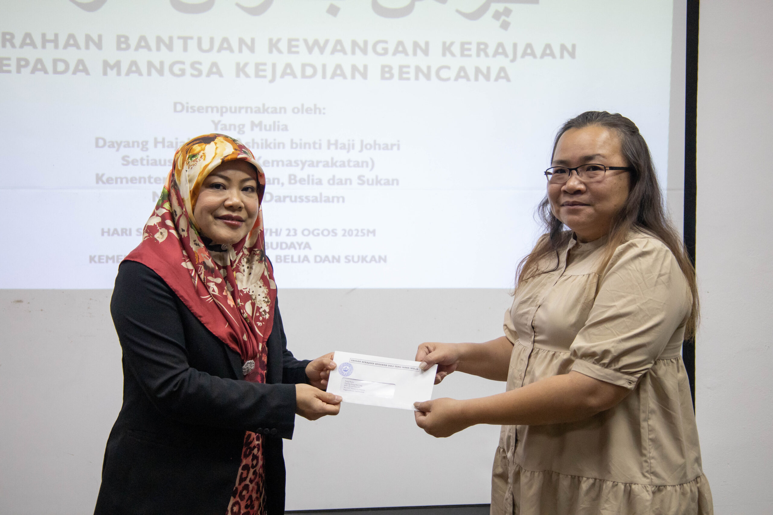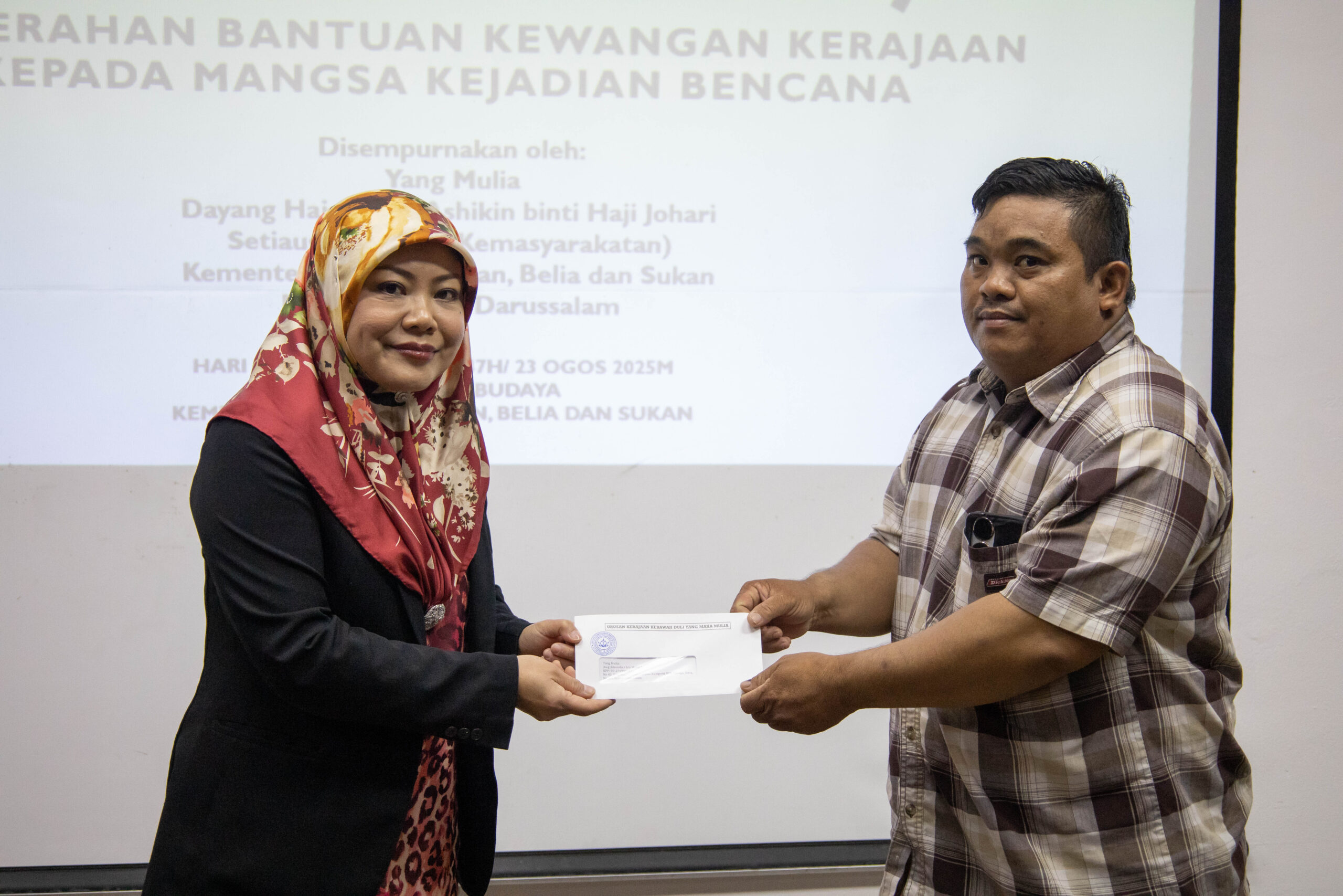 BANDAR SERI BEGAWAN, 24 OGOS – Sebanyak $21,525 jumlah keseluruhan bantuan kewangan dari kerajaan Kebawah Duli Yang Maha Mulia Paduka Seri Baginda Sultan dan Yang Di-Pertuan Negara Brunei Darussalam, melalui Jabatan Pembangunan Masyarakat (JAPEM), Kementerian Kebudayaan, Belia dan Sukan (KKBS), telah diserahkan kepada 16 orang ketua keluarga.
