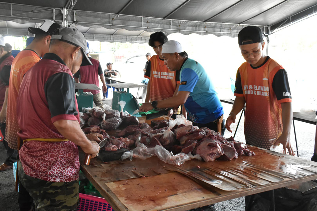 Acara yang menjayakan penyembelihan empat ekor kerbau telah dimulakan dengan kehadiran petugas dan sukarelawan yang melaksanakan kerja-kerja pemotongan serta pembungkusan daging mengikut senarai pendaftaran peserta. Turut menyemarakkan suasana ialah persembahan tausyeh oleh Belia-Belia Masjid Kampung Kilanas.