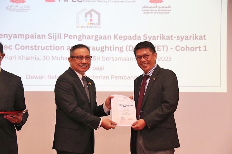 BANDAR SERI BEGAWAN, 17 OGOS – Sebanyak 44 buah syarikat yang memberi latihan kepada pelajar-pelajar program HNTec Construction and Draughting (Dual TVET) cohort pertama telah diraikan pada majlis penyampaian sijil penghargaan, hari ini.