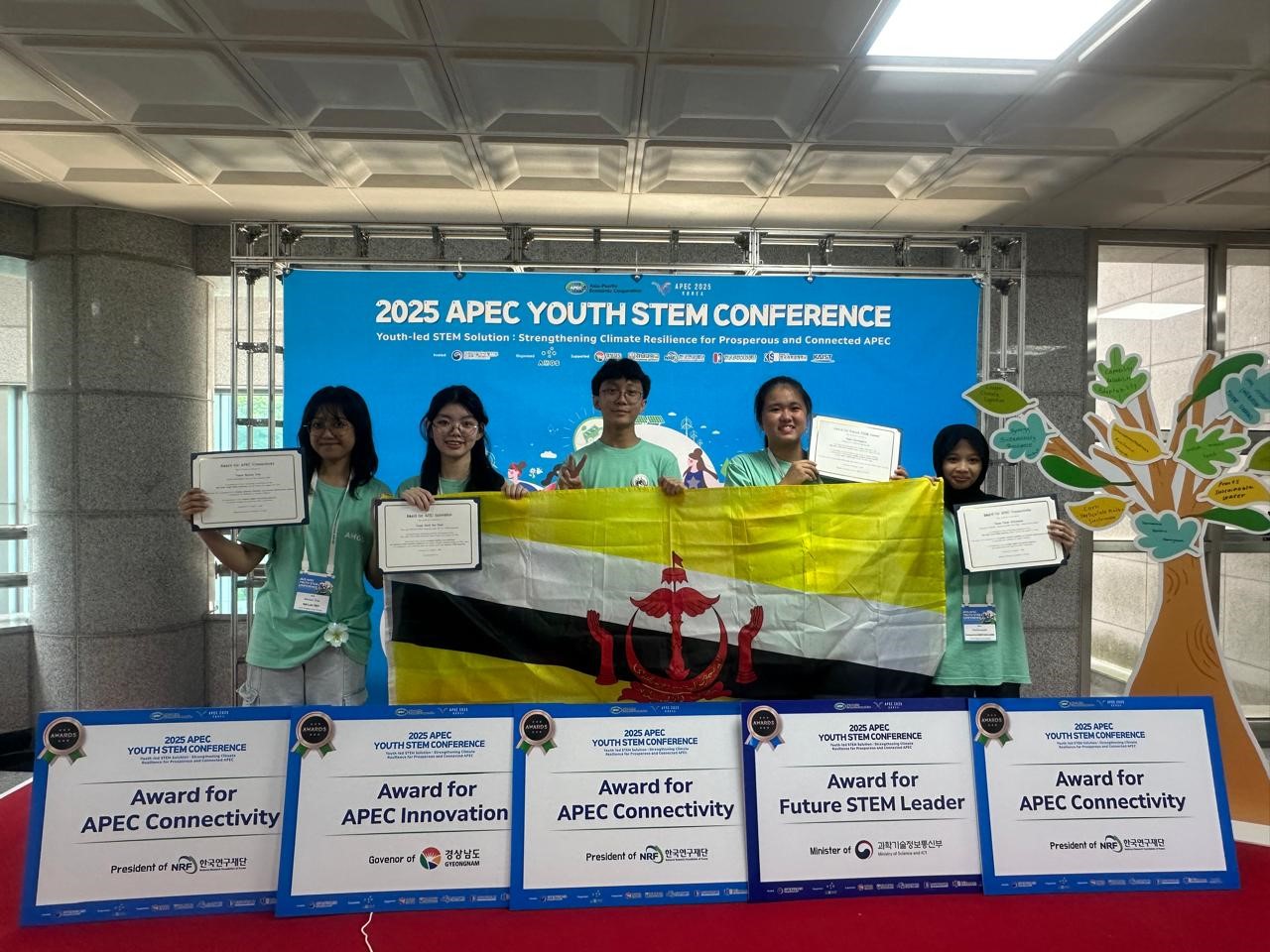BANDAR SERI BEGAWAN, 12 OGOS – Lima pelajar dari Negara Brunei Darussalam berjaya untuk menerima anugerah semasa Persidangan STEM Belia APEC 2025 yang berlangsung di Korea Science Academy of KAIST (KSA), Busan dan Korea Advanced Institute of Science and Technology (KAIST), Daejeon, Republik Korea pada 6 hingga 9 Ogos.