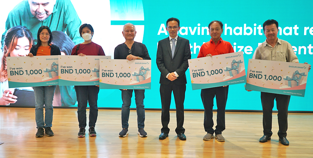 BANDAR SERI BEGAWAN, 16 JUN – Lima orang pelanggan bertuah Bank Baiduri telah membawa pulang wang tunai $1,000 setiap seorang selaku pemenang cabutan bulanan pertama kempen A Saving Habit That Rewards pada majlis penyampaian yang berlangsung di ibu pejabat bank tersebut, hari ini.