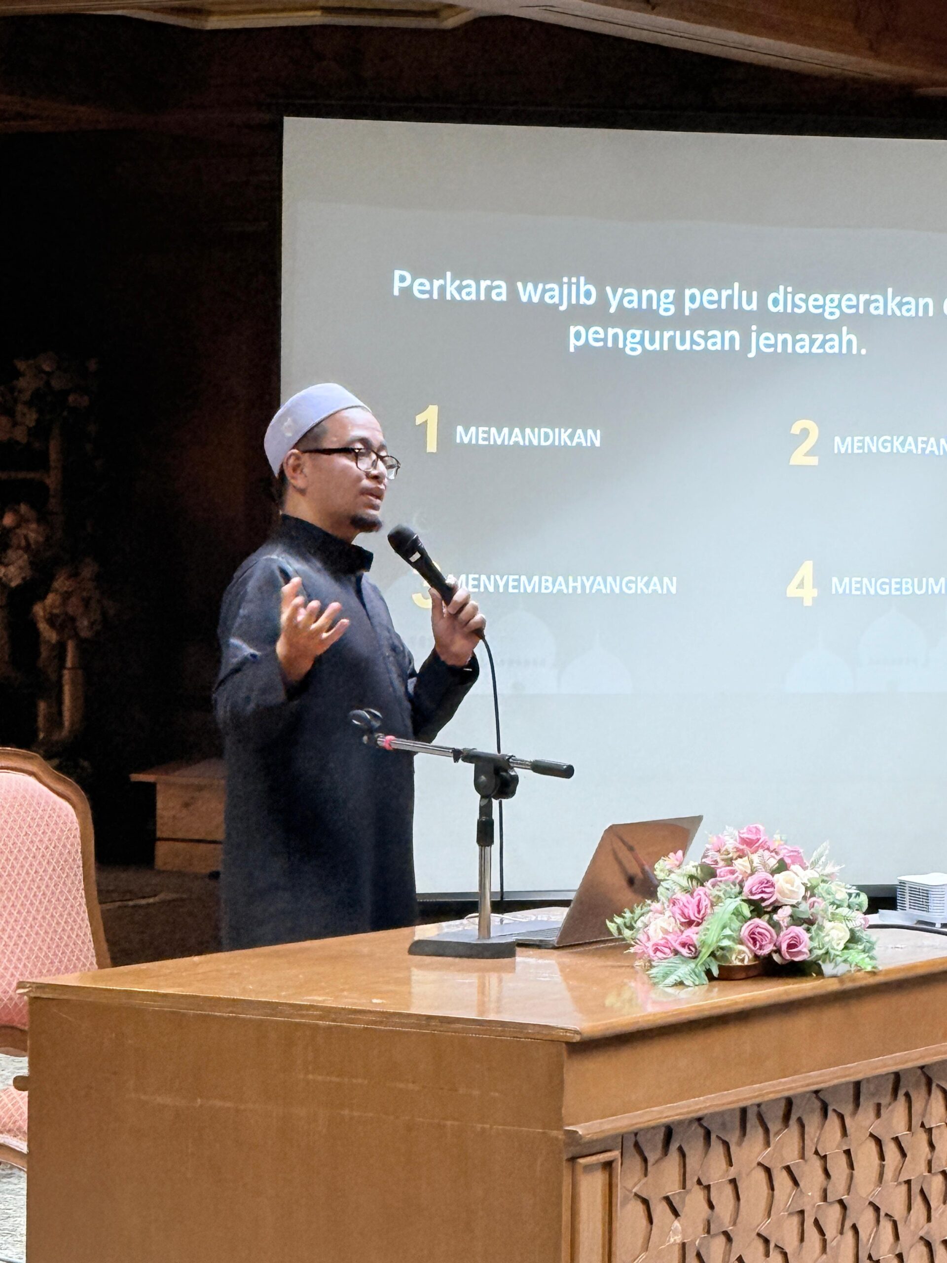 Kursus anjuran Jabatan Hal Ehwal Masjid melalui Bahagian Imarah dan Ahli Jawatankuasa Takmir Jame’ ‘Asr Hassanil Bolkiah dengan kerjasama Takaful Brunei itu bertujuan memperkukuh penguasaan ilmu Fardu Kifayah, khususnya dalam memastikan pengurusan jenazah dilaksanakan dengan tertib, sempurna dan mematuhi tuntutan hukum syarak.
