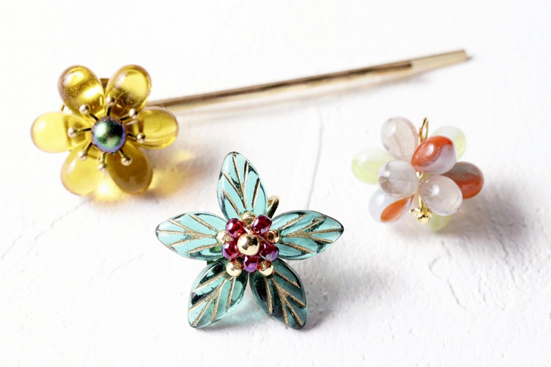 Saya meminta seorang pakar membuat manik, Shizukusa untuk mendapatkan petua tentang cara membuat aksesori menggunakan manik Czech, dan dia mengesyorkan menggunakan manik berbentuk titisan untuk mencipta corak berbentuk jambak bunga.