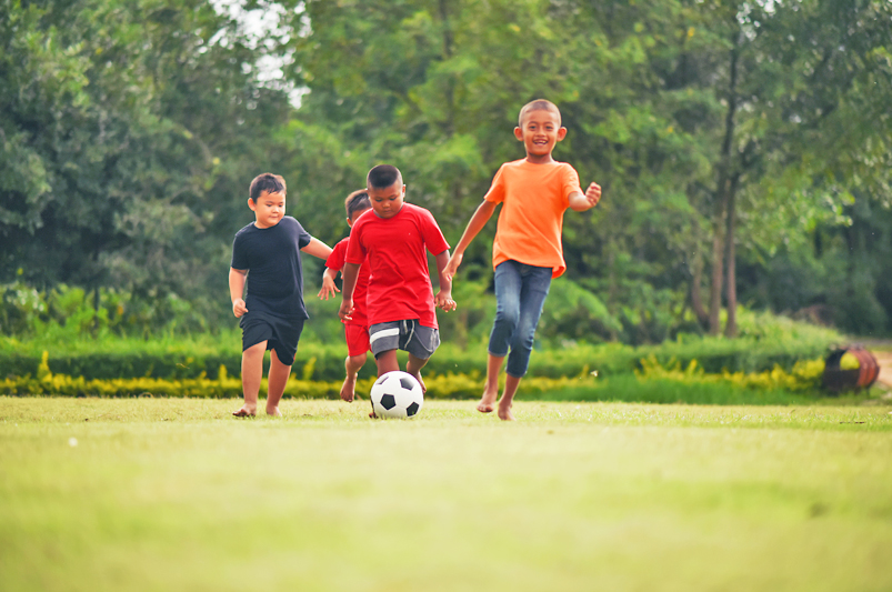 Suara mereka kuat, penuh gelak ketawa dan sorakan. Padang itu tak rata, rumput panjang di tepi dan ada lopak air di tengah, tapi tetap meriah.