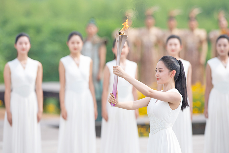 Pengumpul api tersebut menyampaikan obor kepada Yi Lianhong, setiausaha Jawatankuasa Wilayah Zhejiang, Parti Komunis China, yang menyalakan kawah yang reka bentuknya diilhamkan oleh jed cong, model kosmologi terawal dalam tamadun China.