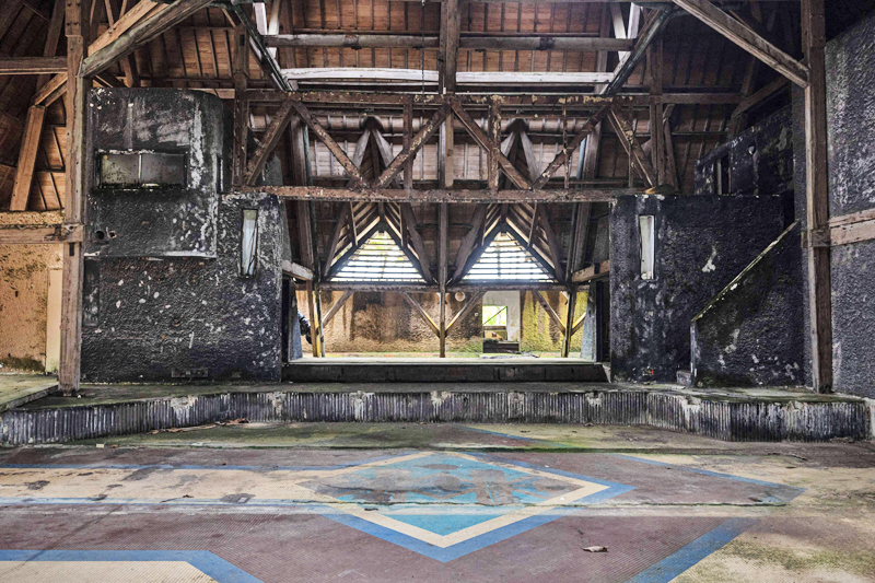 Hari ini, kolam renang telah ditutup dan cahaya matahari menyinari menembusi bumbung bocor pentas yang dahulu menjadi tempat persembahan.