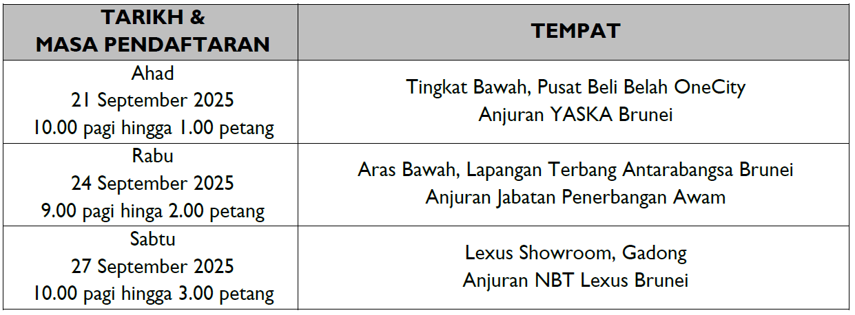 Dalam hubungan itu, Pusat Pendermaan Darah di Jabatan Perkhidmatan Makmal, Kementerian Kesihatan akan mengadakan kempen derma darah yang dibukakan penyertaan kepada orang ramai hari ini, 21 September di Tingkat Bawah, Pusat Beli-belah OneCity anjuran YASKA Brunei bermula pukul 10 pagi hingga pukul 1 petang, Kemudian, kempen turut diadakan pada 24 September di Aras Bawah, Lapangan Terbang Antarabangsa Brunei anjuran Jabatan Penerbangan Awam bermula pukul 9 pagi hingga pukul 2 petang dan pada 27 September di Lexus Showroom, Gadong anjuran NBT Lexus Brunei bermula pukul 10 pagi hingga pukul 3 petang.