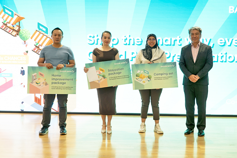 BANDAR SERI BEGAWAN, 16 FEB – Tiga pemenang hadiah utama promosi Shop the smart way, everyday anjuran Bank Baiduri telah menerima hadiah mereka dalam satu majlis yang berlangsung di Atrium Ibu Pejabat Bank Baiduri hari ini.