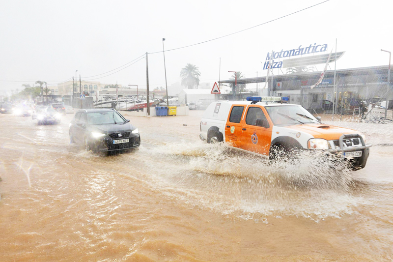 Kenderaan dilihat bergerak perlahan meredah air banjir yang keruh di Ibiza dan Formentera dalam suasana langit gelap disertai guruh serta kilat. Beberapa pemandu dilaporkan memerlukan bantuan menyelamat, menurut rakaman video di media sosial.