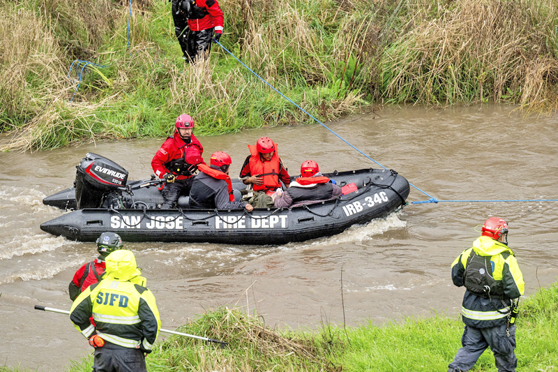 Di selatan San Jose, anggota kecemasan mengeluarkan pemandu dari tingkap kereta yang terkandas oleh banjir dan menyelamatkan orang dari perkhemahan di tepi sungai yang semakin meningkat paras airnya.