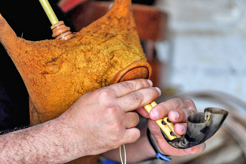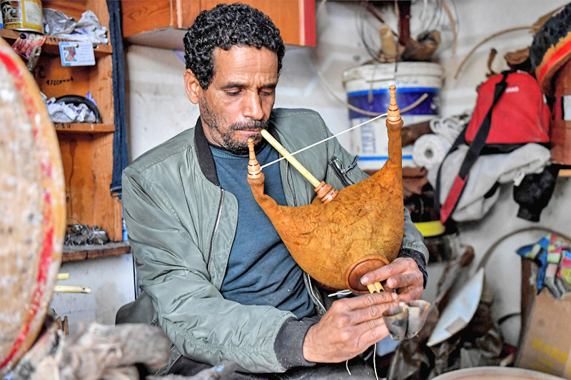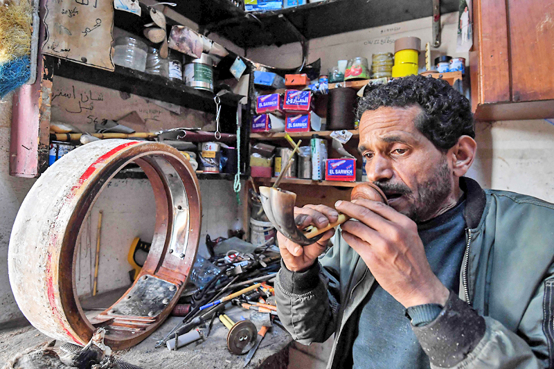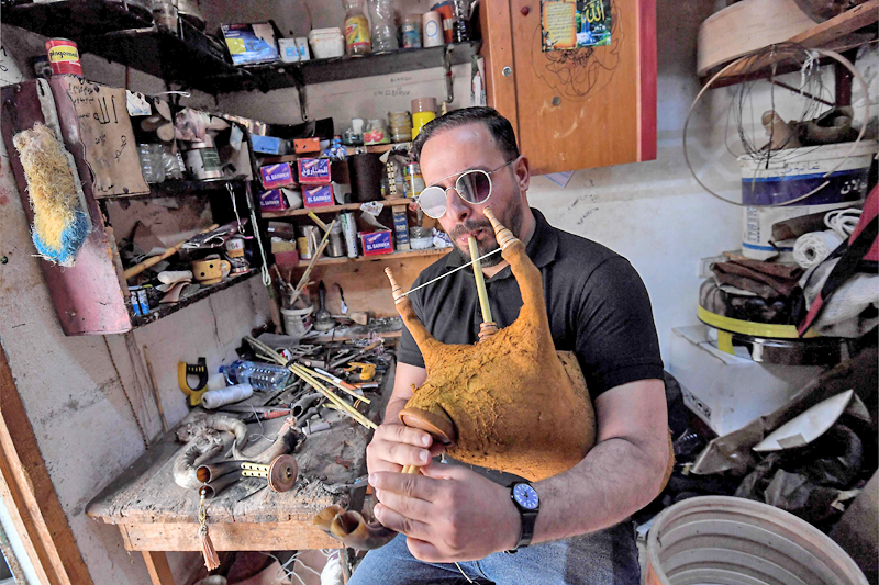 Dikenali sebagai ‘mizwad’, ia ‘mesti diperbuat daripada unsur semula jadi’, kata tukang berusia 50 tahun itu, sambil mengambil dua tanduk lembu dan menyambungkannya dengan buluh sungai dan beg kulit kambing untuk menghasilkan not muzik.