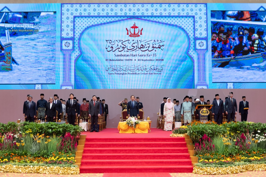 BANDAR SERI BEGAWAN, 23 SEPT – Kebawah Duli Yang Maha Mulia Paduka Seri Baginda Sultan Haji Hassanal Bolkiah Mu’izzaddin Waddaulah, Sultan dan Yang Di-Pertuan Negara Brunei Darussalam berkenan berangkat ke Majlis Sambutan Hari Guru Ke-35 di Dewan Plenari, Pusat Persidangan Antarabangsa, Berakas pagi tadi.