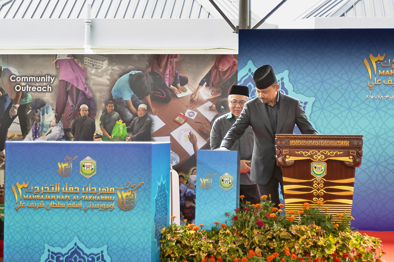 Duli Yang Teramat Mulia kemudiannya berkenan mengurniakan sabda perasmian dan seterusnya menyaksikan tayangan video pelancaran MHT ke-13 dengan tema ‘Transformasi Masa Depan Pertanian Moden dan Sekuriti Makanan Halal: Menguasai Horizon Baharu’ serta menandatangani lembaran kenangan Perasmian MHT ke-13 UNISSA.