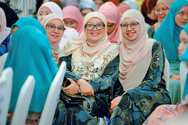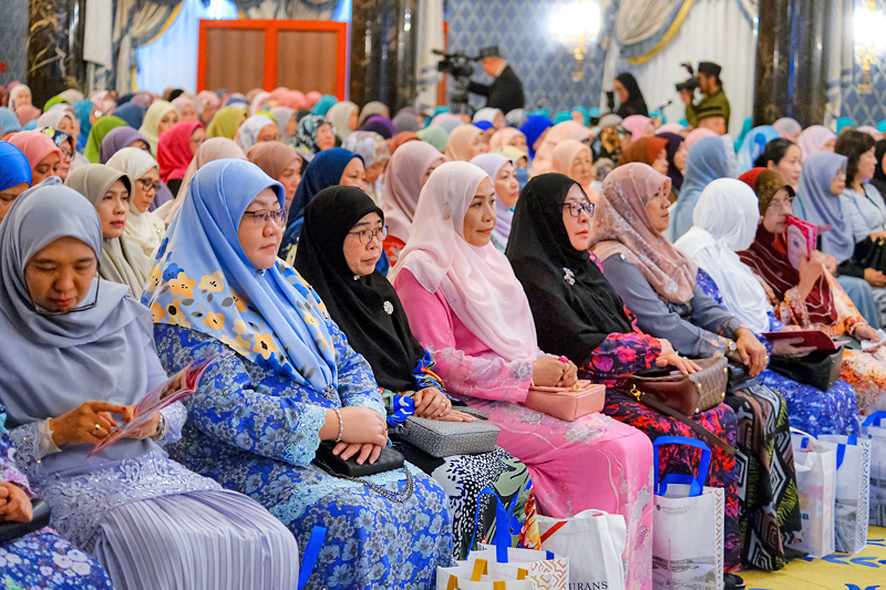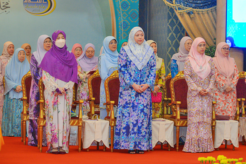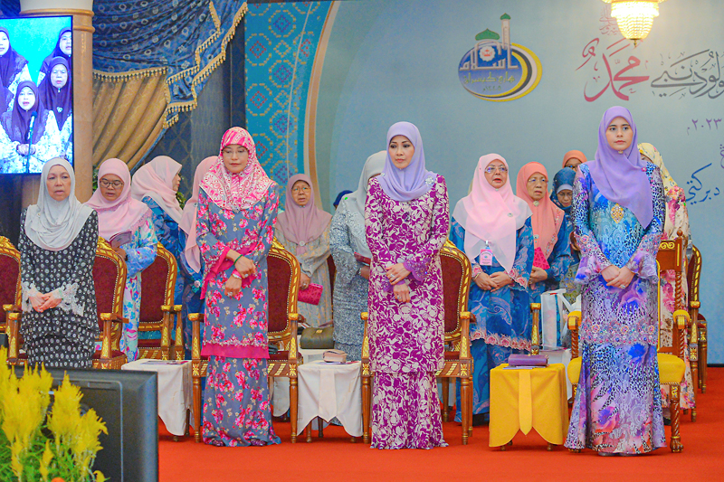 Turut menjunjung ialah Ketua Hakim Syarie, Yang Berhormat Pehin Orang Kaya Paduka Seri Utama Dato Paduka Seri Setia Haji Awang Salim bin Haji Besar; Timbalan Menteri Hal Ehwal Ugama, Pengiran Dato Seri Paduka Haji Mohd Tashim bin Pengiran Haji Hassan; Setiausaha Tetap di Kementerian Hal Ehwal Ugama (KHEU), Haji Mohammad Rosli bin Haji Ibrahim; Ra’es Kolej Universiti Perguruan Ugama Seri Begawan (KUPU SB), Dr Haji Adanan bin Haji Basar; dan pemangku timbalan setiausaha tetap di KHEU serta para penasihat bersama dan pengendali bersama Jawatankuasa Kerja Majlis Perhimpunan Khas Wanita sempena Sambutan Maulud Nabi Muhammad SAW Tahun 1445 Hijrah.