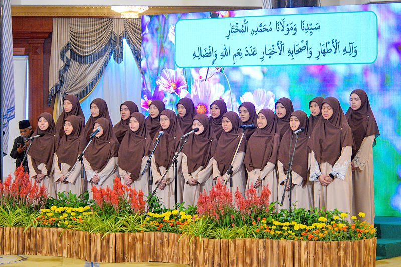 Acara diteruskan dengan bacaan selawat oleh siswi ‘Aliyah Tertinggi Qiraat Institut Tahfiz Al-Quran Sultan Haji Hassanal Bolkiah (ITQSHHB) dan Doa Selamat bagi memberkati majlis telah dibacakan oleh Pegawai Ugama Kanan, Jabatan Hal Ehwal Masjid, KHEU, Dayang Noraini Yanti binti Haji Hussin.