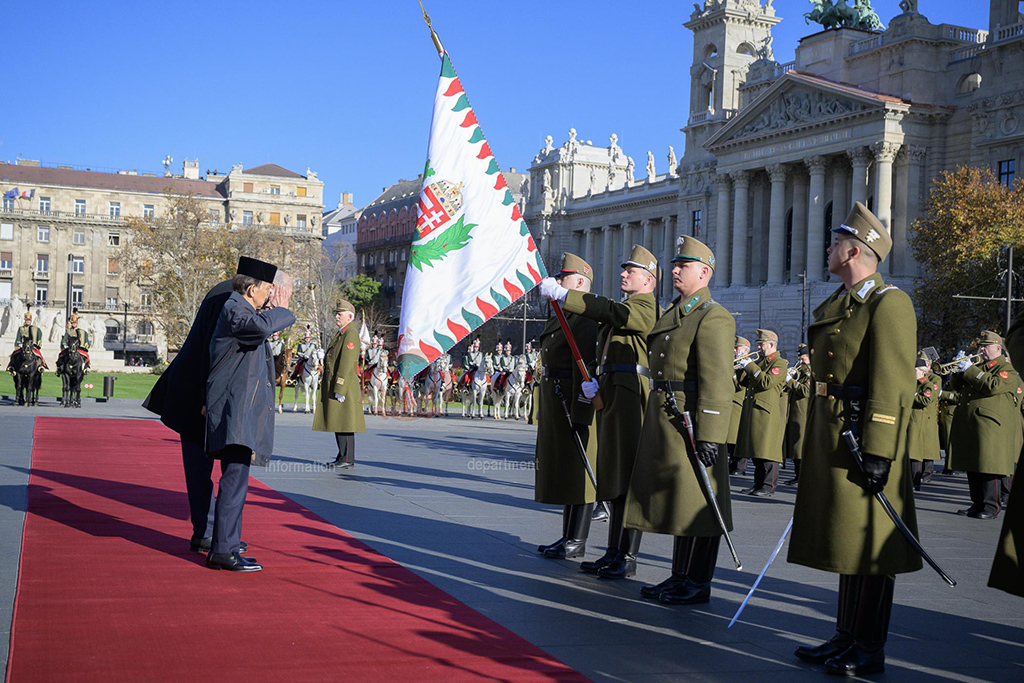 Semasa majlis tersebut, Kebawah Duli Yang Maha Mulia bersama-sama Tuan Yang Terutama Presiden Hungary memeriksa Barisan Kawalan Kehormatan yang terdiri daripada anggota Hungarian Armed Forces. Lagu Kebangsaan kedua-dua buah negara kemudiannya dimainkan.