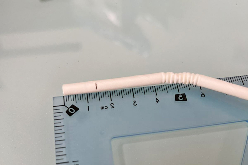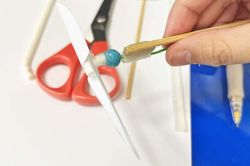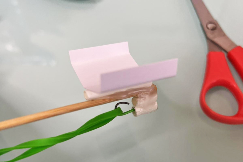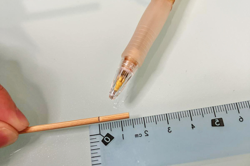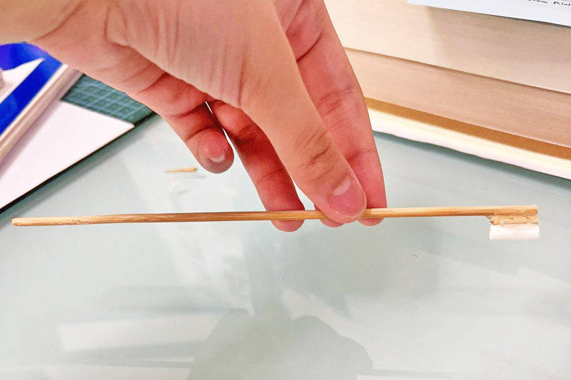 Selepas itu, ukur dan potong penyedut minuman sepanjang 1.5 cm, kemudian lekatkannya di bawah batang kayu yang baru dilekatkan. Ini membentuk bahagian hadapan fiuslaj. (Gambar 4 & 5)