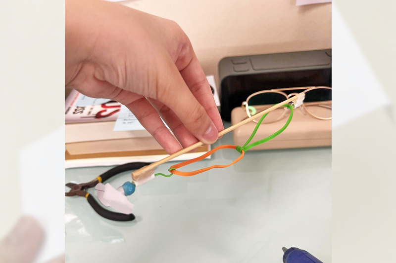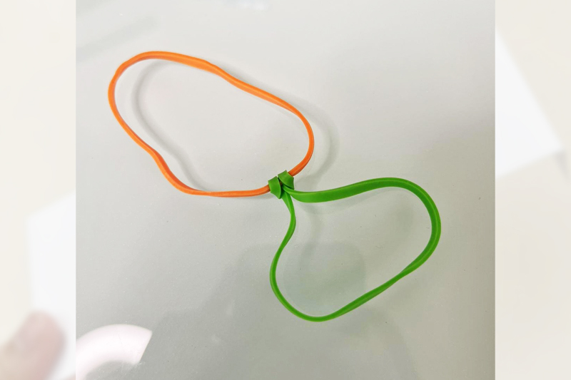 Jumlah gelang getah bergantung pada tahap ketegangan yang diperlukan. Jika satu gelang terlalu tegang, tambahkan satu lagi dengan teknik menyambung seperti dalam gambar. (Gambar 11)