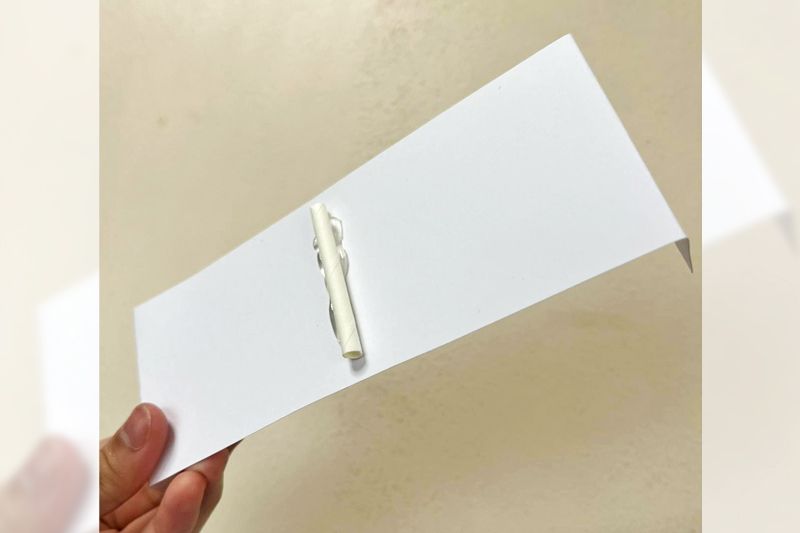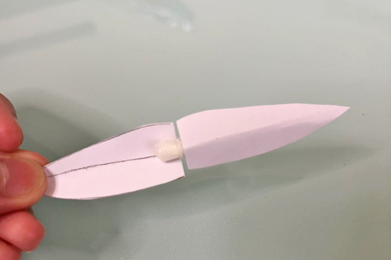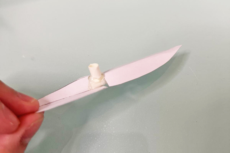 Lukis dua bilah kipas yang sama saiz daripada kertas kad dan bentukkan lengkungan agar dapat mengumpul udara semasa berpusing. Potong dan lekatkan kedua-dua bilah secara bersilang pada satu batang pendek penyedut minuman. (Gambar 7)