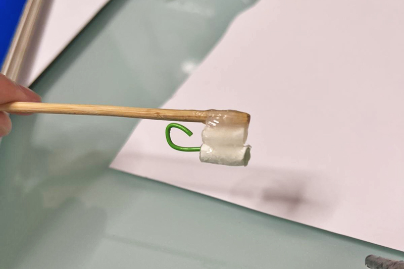 Letakkan bahagian kedua di bawah yang pertama, kemudian bentuk penyangkut menggunakan klip kertas dan selitkan ke dalam tiub kedua tadi. Pastikan ia diposisikan sebelum gam panas diletakkan agar dapat berfungsi sebagai pemegang gelang getah. (Gambar 6)