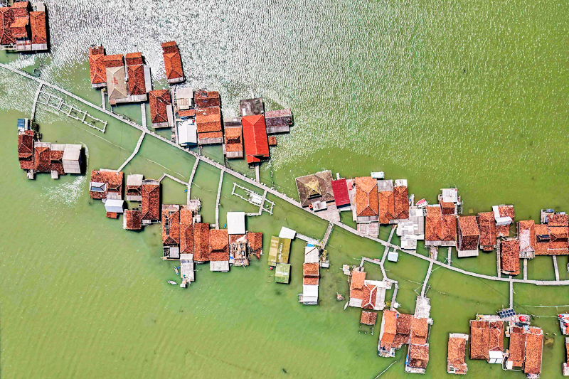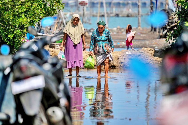 PEKALONGAN, INDONESIA – Air laut menampar jalan raya di kampung Karminah, mengancam kediamannya di pulau Jawa, Indonesia, di mana kerajaan berkata ia mempunyai rancangan untuk menahan air pasang yang masuk.