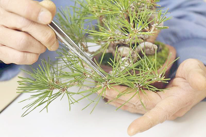 Memangkas bonsai dengan pinset apabila daun berubah warna membina lampiran pada tumbuhan.