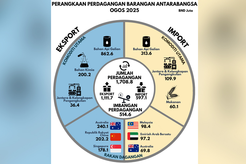 BANDAR SERI BEGAWAN, 30 OKT – Negara Brunei Darussalam mencatat jumlah perdagangan sebanyak $1,708.8 juta bagi bulan Ogos 2025, yang terdiri daripada eksport berjumlah $1,111.7 juta dan import berjumlah $597.1 juta.