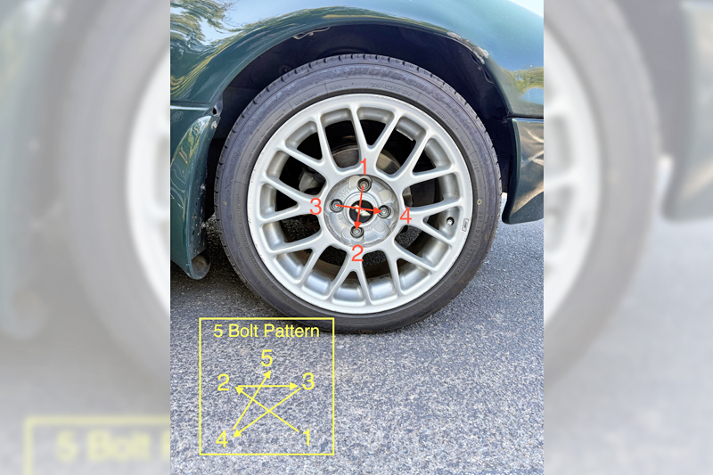 Gunakan sepana tayar untuk mengetatkan semua nat mengikut corak ‘X’ atau bintang, memastikan tekanan sekata pada setiap nat. Ketatkan sekuat yang mampu tanpa memaksa. (Gambar 13)