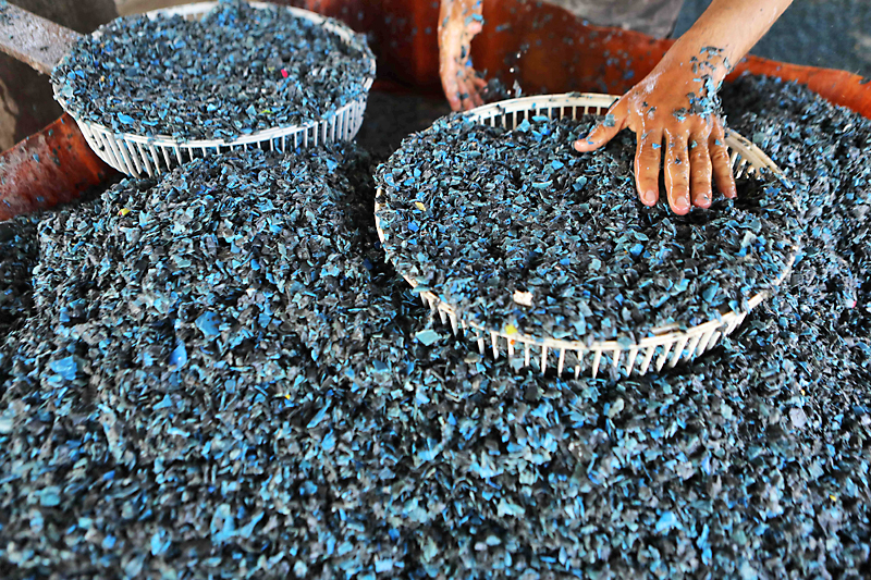 Mereka kemudian memotongnya dan menghancurkannya menjadi kepingan kecil yang dicuci dan dicairkan menjadi palet plastik.
