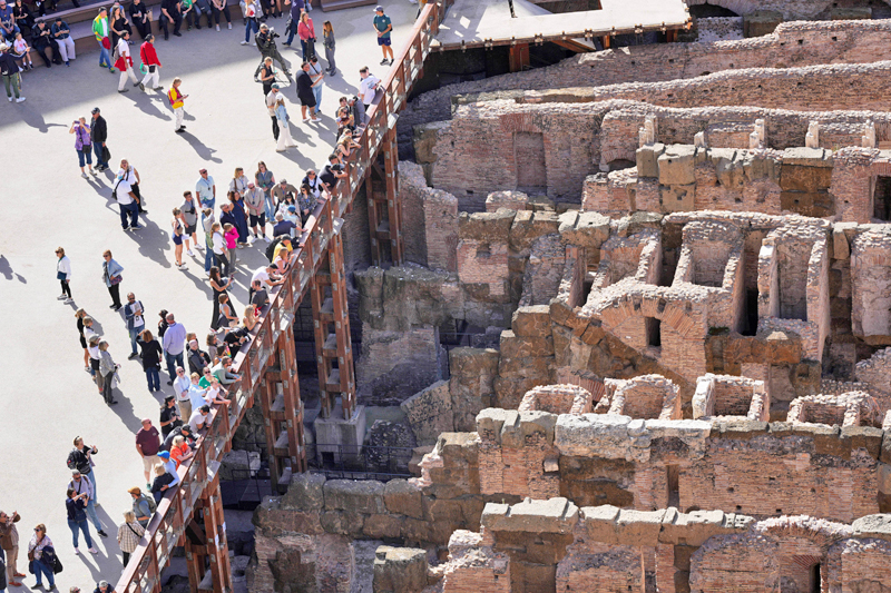 Melihat ke arena dari atas, kesibukan pelancong bagaikan sebuah busut. Colosseum menerima hampir 9 juta pengunjung tahun lalu, meningkat daripada 7 juta pada tahun sebelumnya, menurut data taman itu.