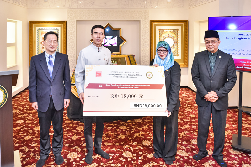BANDAR SERI BEGAWAN, 5 APRIL – Sejumlah $18,000 telah disumbangkan ke Dana Pengiran Muda Mahkota Al-Muhtadee Billah untuk Anak-anak Yatim (DANA) daripada Kedutaan Besar Republik Rakyat China di Negara Brunei Darussalam dalam satu majlis penyerahan yang berlangsung di Pusat Pengajian Kesenian dan Kaligrafi Islam, Yayasan Sultan Haji Hassanal Bolkiah, Jalan Jerambak, pagi tadi.