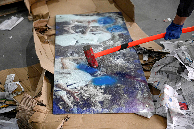 LANGFANG, CHINA – Di sebuah gudang di utara China, Liu Wei memasukan foto pasangan pengantin yang berseri-seri ke dalam mesin pencincang industri – mengubah kisah patah hati menjadi sumber elektrik.