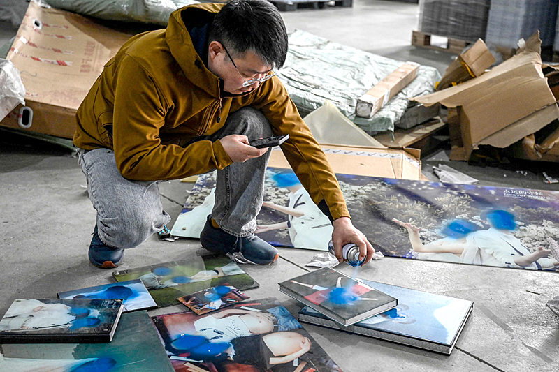 Sambil mencontong foto, Liu menggunakan telefonnya untuk merakam gambar-gambar yang telah dipampan dan menghantar klip video kepada pelanggan untuk pengesahan akhir.