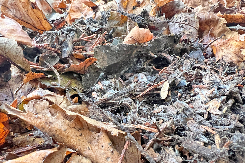 Menjelang musim bunga, teksturnya akan berubah menjadi bahan organik gelap, rapuh dan kaya nutrien yang menjadi lapisan pelindung di lantai hutan.