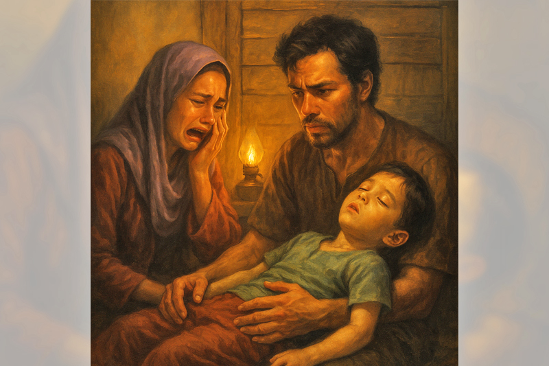 Dewata sedang menggendong puteranya yang sudah pun sedar diri pengsannya tadi.