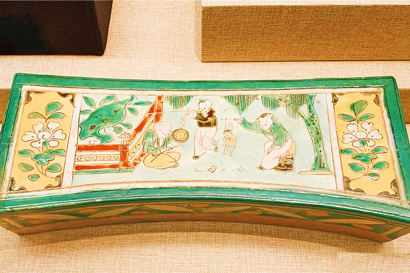 Terdapat bantal porselin yang terkenal, kini ditempatkan di Muzium Istana di Beijing. Ia berasal dari tanur Ding pada Dinasti Song Utara dan berbentuk seperti anak damit yang berbaring dalam keadaan meniarap di atas katil yang memanjang. Bantal bertekstur licin ini dianggap sebagai salah satu lambang karya era itu.