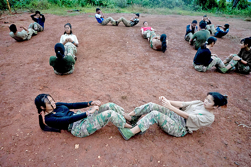 Memakai seluar tentera dan kemeja-T, rekrut wanita pergi berjoging waktu pagi di sepanjang trek tanah yang diiringi dengan bunyi wisel pengajar yang sangat nyaring.