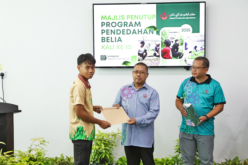 BANDAR SERI BEGAWAN, 6 JULAI – Seramai 19 peserta terdiri daripada kalangan belia sektor swasta, akademik dan individu persendirian telah diraikan dalam Majlis Penutup dan Penyampaian Sijil bagi Program Pendedahan Belia-belia yang Berpotensi untuk Menceburi Bidang Pertanian Berteknologi Tinggi ke-10 yang berlangsung di Pusat Perkhidmatan dan Latihan Lepas Tuai, Pejabat Kawasan Kemajuan Pertanian (KKP) Tungku, kelmarin.