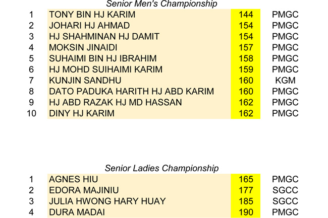 Dalam perlawanan Kejohanan Senior Lelaki, Awang Tony muncul sebagai juara dengan mencatatkan skor 144, di tempat kedua ialah Awang Johari Haji Ahmad dengan skor 154 dan tempat ketiga ialah Haji Shahminan Haji Damit dengan skor 154.