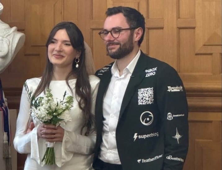 Pada 25 Oktober lalu, Dagobert mengahwini Anna dalam majlis kecil dihadiri hanya 16 tetamu, sambil mengenakan jaket sut yang dihiasi nama 26 syarikat pemula yang menjadikan impian itu kenyataan. Para tetamu menganggap idea tersebut menarik, namun Renouf mengakui dia sentiasa risau tentang keterlihatan semua logo di jaketnya.