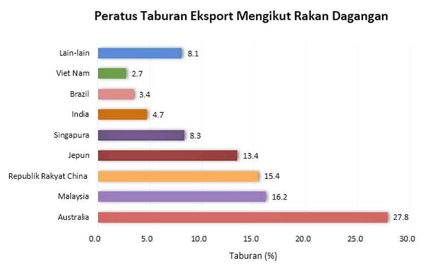 Bagi pasaran eksport utama pada bulan November 2022 adalah Australia (27.8 peratus), diikuti oleh Malaysia (16.2 peratus), dan Republik Rakyat China (15.4 peratus). Komoditi eksport terbesar ke Australia dan Malaysia adalah bahan api galian, manakala Republik Rakyat China adalah bahan kimia.