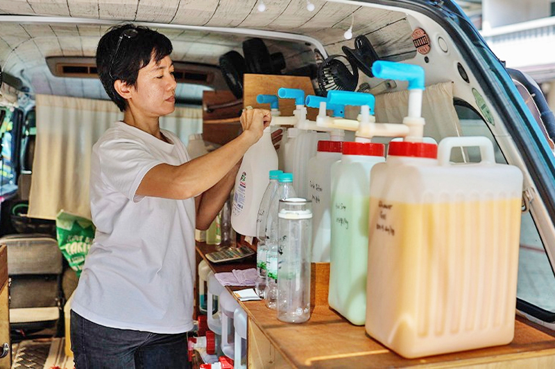 Beliau menyifatkan perniagaannya sebagai usaha mengurangkan plastik, walhal beliau sendiri mengisi pelbagai cecair daripada bekas plastik besar ke dalam pelbagai botol plastik lain.