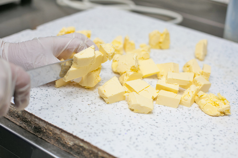 Seterusnya, cairkan mentega secara perlahan. Dalam mangkuk lain, pecahkan telur dan kacau perlahan sehingga sebati. Masukkan susu pekat dan kacau sebati, kemudian tuangkan mentega cair sedikit demi sedikit sambil diadun perlahan.