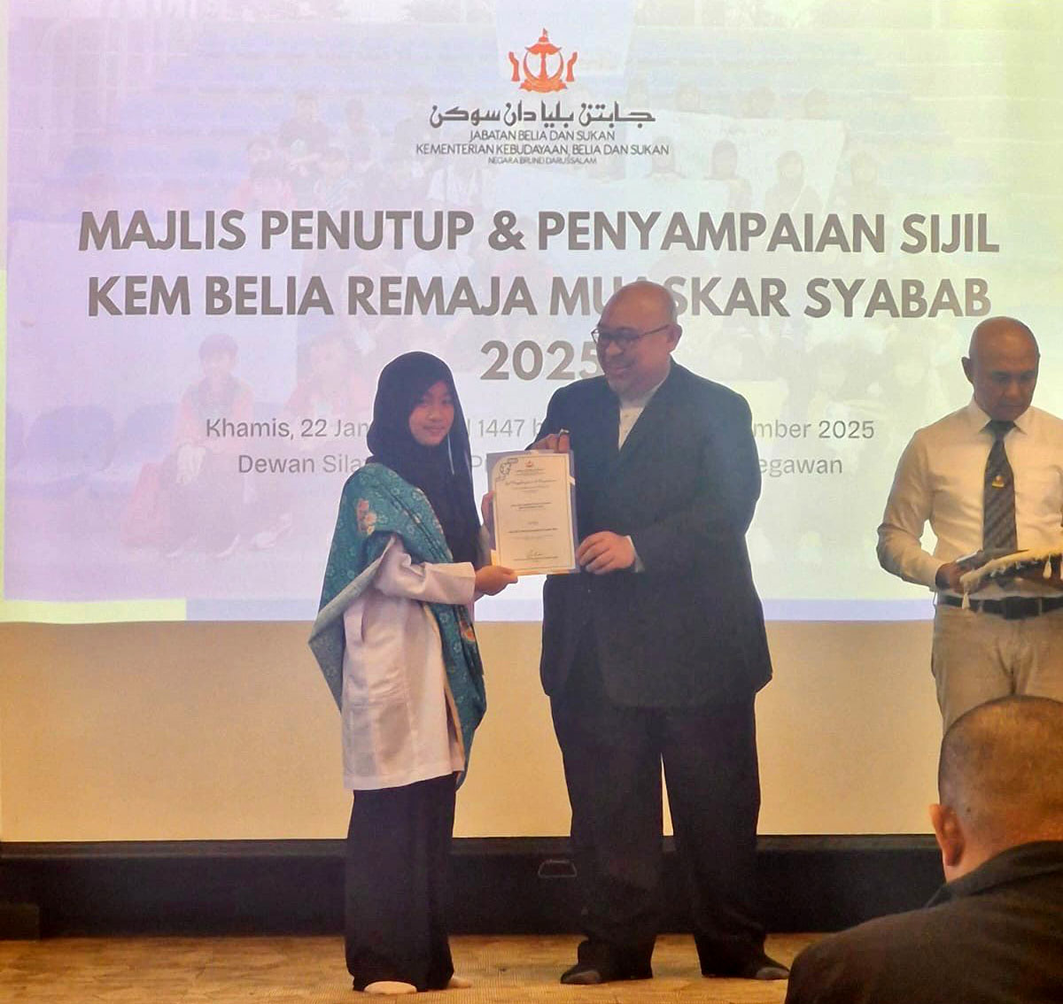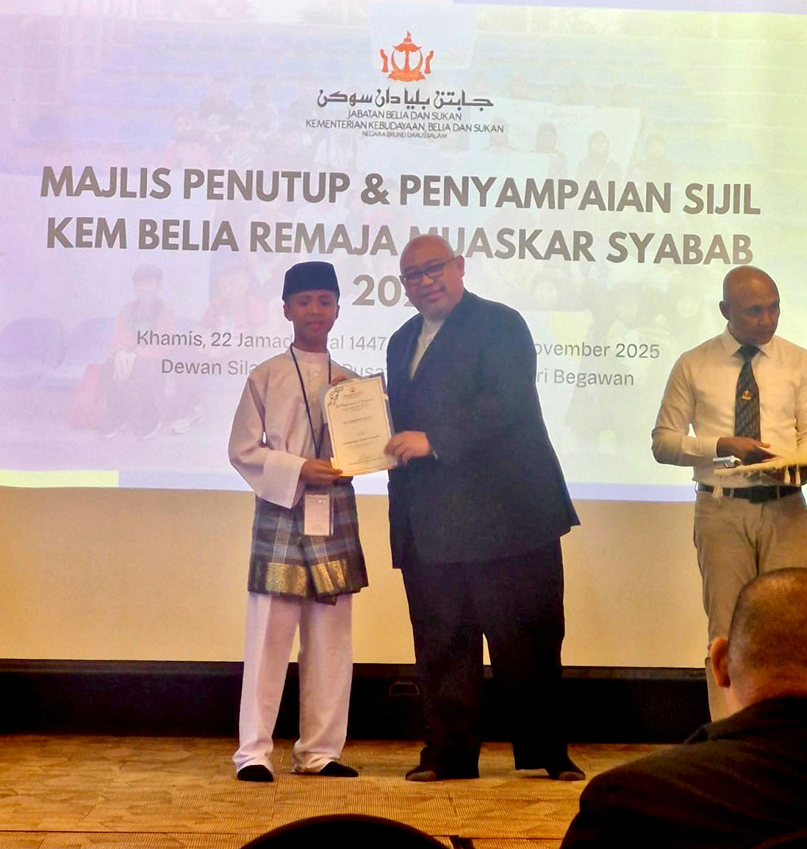 Susulan itu, para peserta menerima sijil dan diraikan dalam Majlis Penutup dan Penyampaian Sijil bagi Kem Belia Remaja Muaskar Syabab yang dihadiri oleh Pegawai Pentadbir Kanan, Jabatan Belia dan Sukan, Awang Mohamad Iskandar bin Haji Idris.