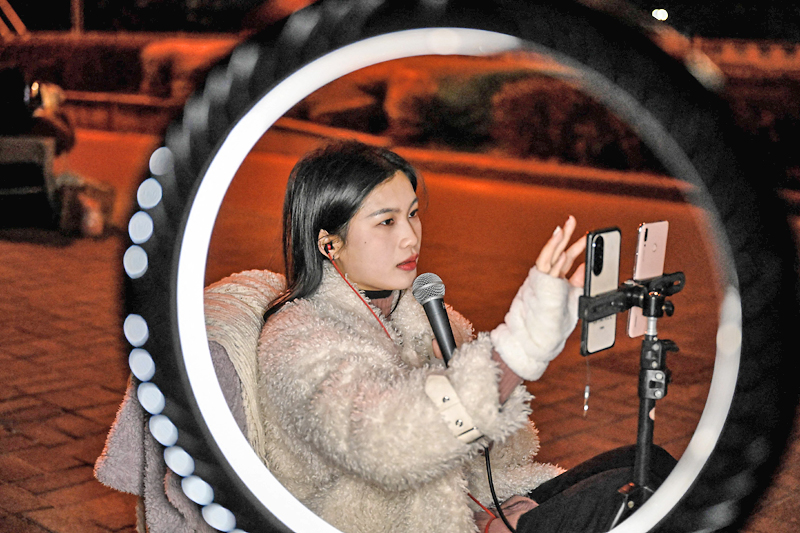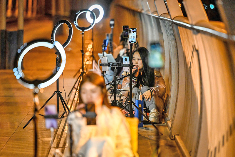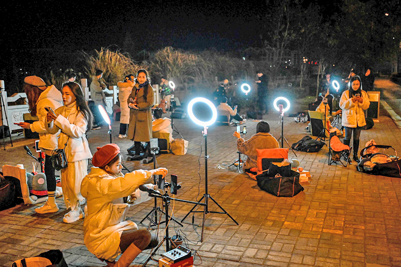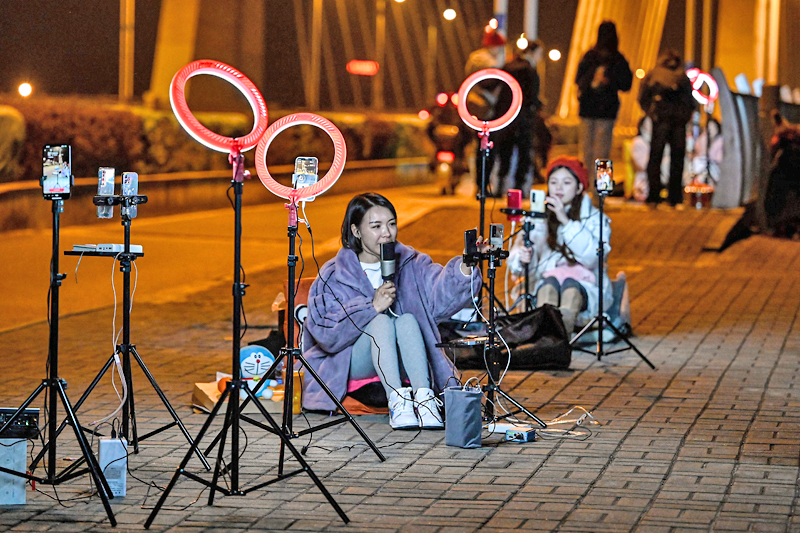 Penyiar-penyiar berkenaan berkumpul di tempat-tempat seperti ini di bandar Guilin kebanyakan malam dengan harapan dapat menarik perhatian ‘orang yang lalu-lalang’ yang sedang melayari siaran langsung di Douyin, versi TikTok di China, di mana penonton boleh menderma kepada penyiar yang disukai mereka.