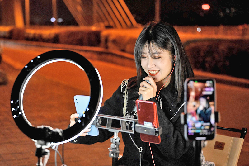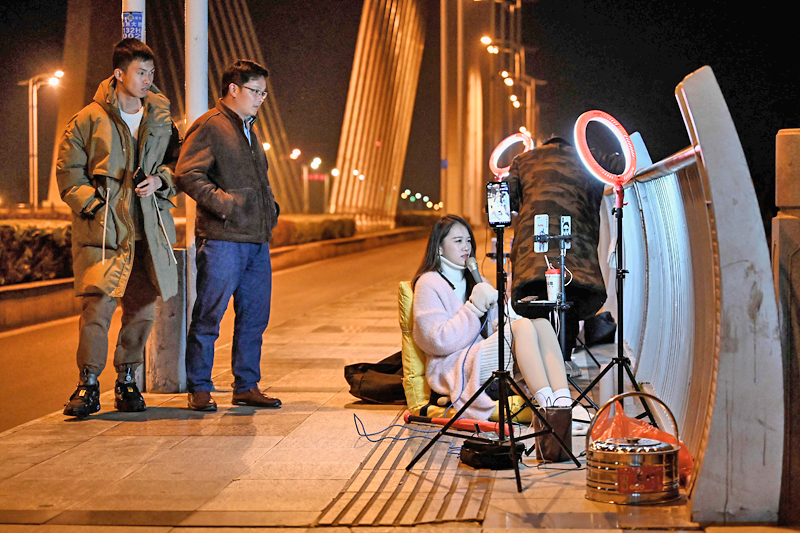 GUILIN, CHINA – Dalam keheningan malam di atas jambatan di selatan China, kira-kira 20 orang penyiar langsung duduk sambil menyanyi dan berbual-bual dalam mikrofon, lingkaran cahaya mereka yang sama diletak dalam jarak beberapa meter.