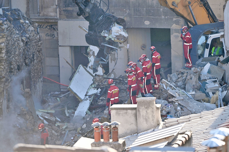 Lebih 24 jam selepas letupan yang disyaki berlaku di bangunan itu, di mana penduduk melaporkan bau gas yang kuat, berpuluh-puluh pasukan pencari dan anjing pengesan bekerja di tengah-tengah runtuhan ketika api masih marak di bawahnya.