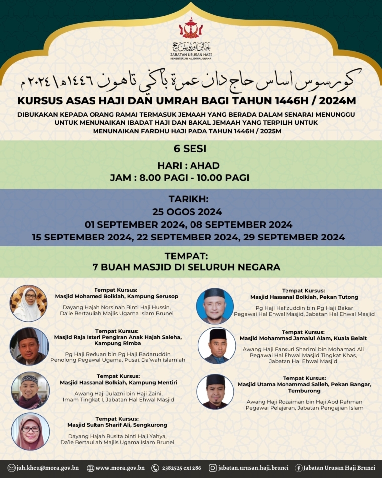 BANDAR SERI BEGAWAN, 20 OGOS – Kursus Asas Haji dan Umrah bagi Tahun 1446H/2024M akan diadakan sebanyak 6 sesi di 7 buah masjid yang terpilih di seluruh negara bermula jam 8 pagi hingga 10 pagi.