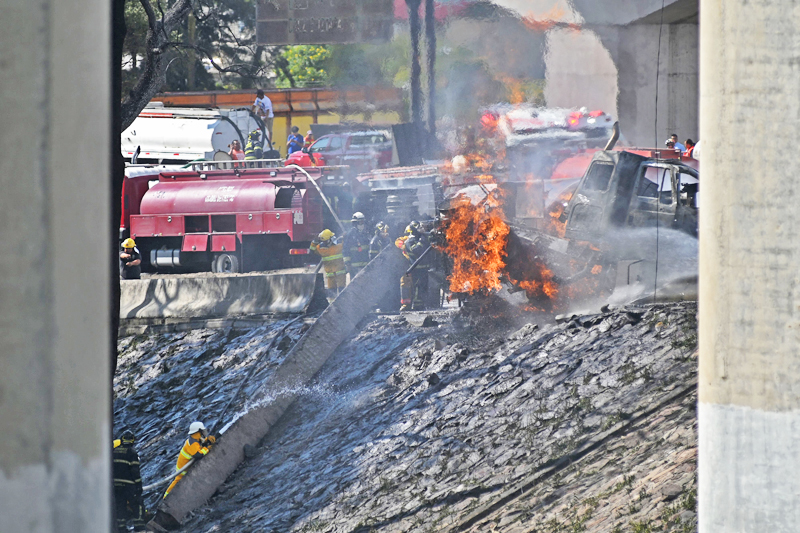 Lori yang membawa hampir 50,000 liter gas itu dipercayai terbalik sebelum meletup. – AFP
