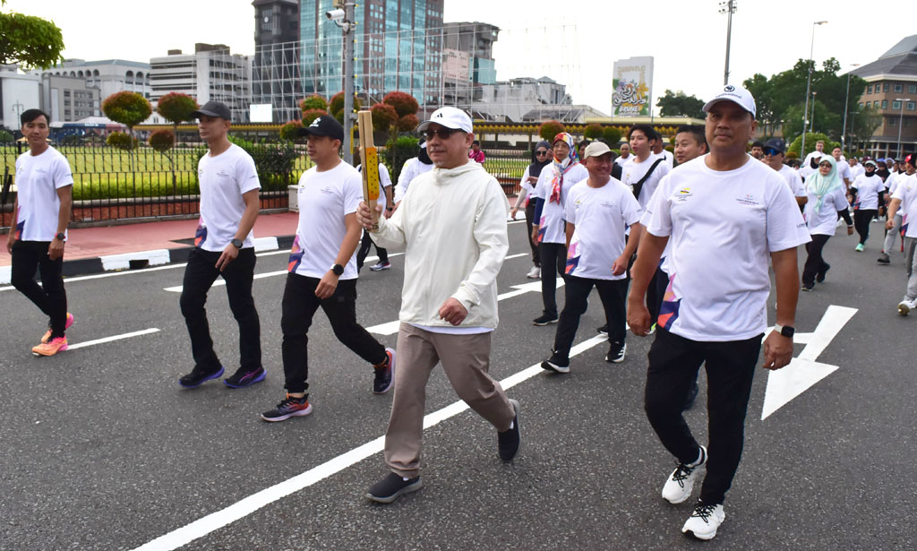 Sebelum acara relay dimulakan, Yang Berhormat Dato Seri Setia Haji Muhammad Juanda menerima King’s Baton daripada Naib Presiden Majlis Olimpik Kebangsaan Negara Brunei Darussalam, Haji Mohd Zamri bin Dato Paduka Haji Hamdani.